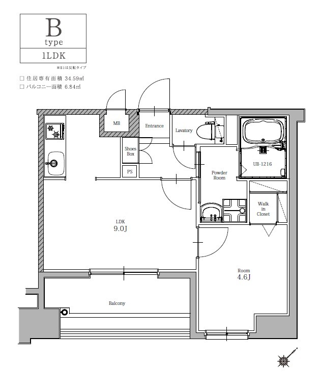 | 間取り内訳 | 洋4.6帖 | 専有面積 | 34.59㎡ |